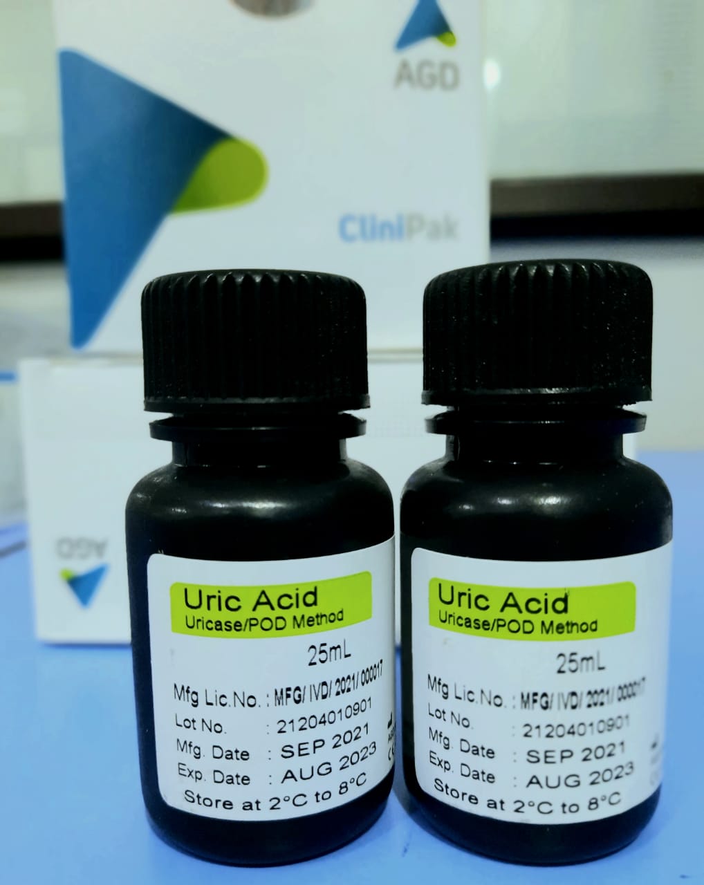 Uricase transforms Uric acid in the sample into Allantoin, Carbondioxide(CO2) and Hydrogen peroxide(H2O2). By the action of Peroxidase and in the presence of phenol-derivative, DHBS and 4-Aminoantipyrine, Hydrogen peroxide gives a colored indicator reation which can be measured at 520 nm. The increase in absorbance correlates with the Uric acid concentration of the sample.